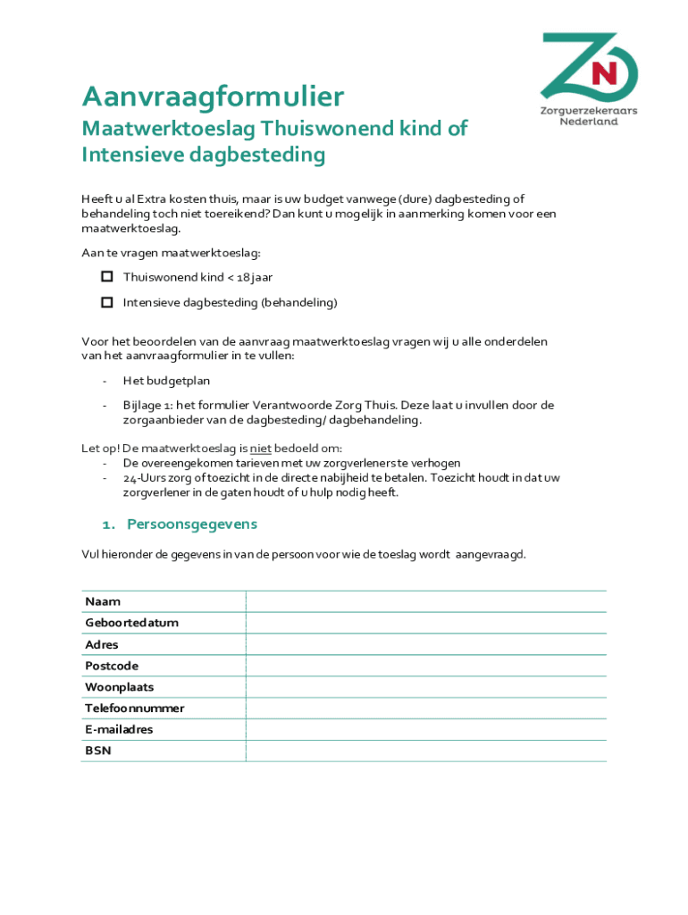 Aanvraagformulier Maatwerktoeslag Thuiswonend kind of Intensive dagbesteding Heft u all Extra often thews, Mar is UW budget vantage (due) dagbesteding of rehandling touch diet Torfaen? Dan aunt u