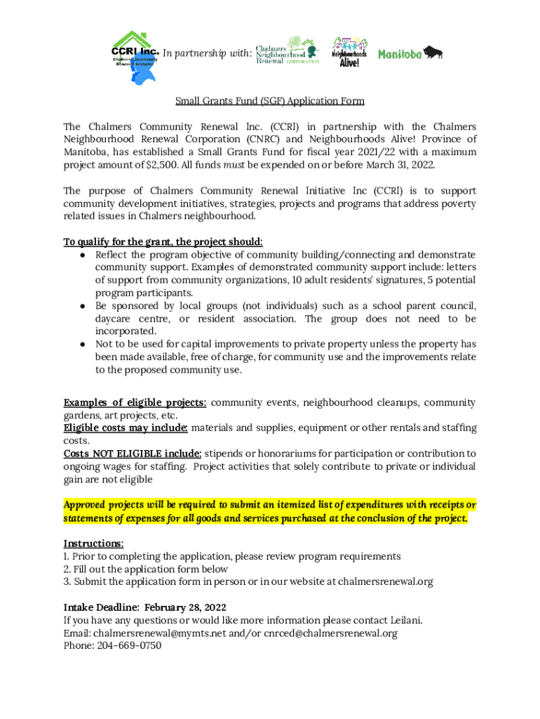 In partnership with:Small Grants Fund (SGF) Application Form The Chalmers Community Renewal Inc. (CCRI) in partnership with the Chalmers Neighborhood Renewal Corporation (CNC) and Neighborhoods Alive!
