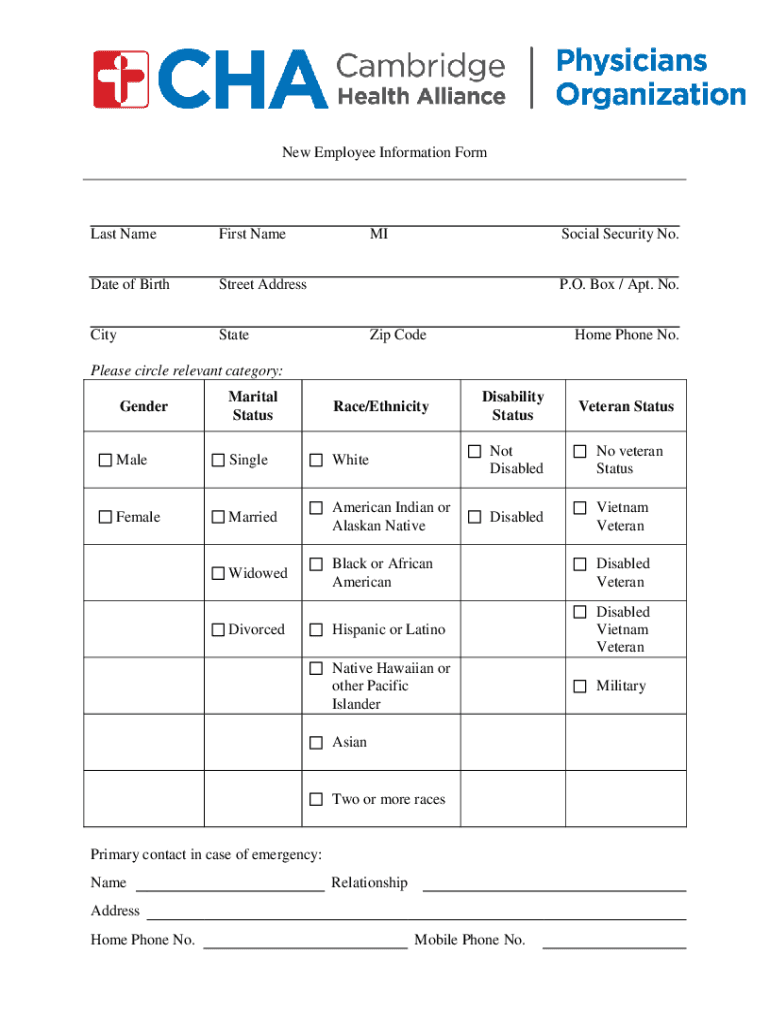 New Employee Information Format NameFirst Name Date of Bradstreet AddressCityStateMISocial Security No. P.O. Box / Apt. No. Zip Wodehouse Phone No. Please circle relevant category: GenderMarital Stature×EthnicityDisability