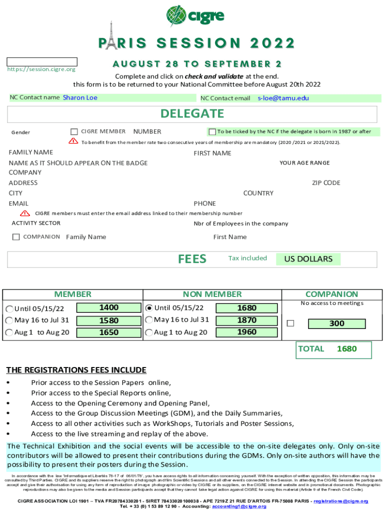 HTTPS://session.CIGRÉ.complete and click on check and validate at the end. This form is to be returned to your National Committee before August 20th 2022NC Contact name Sharon Long Contact email