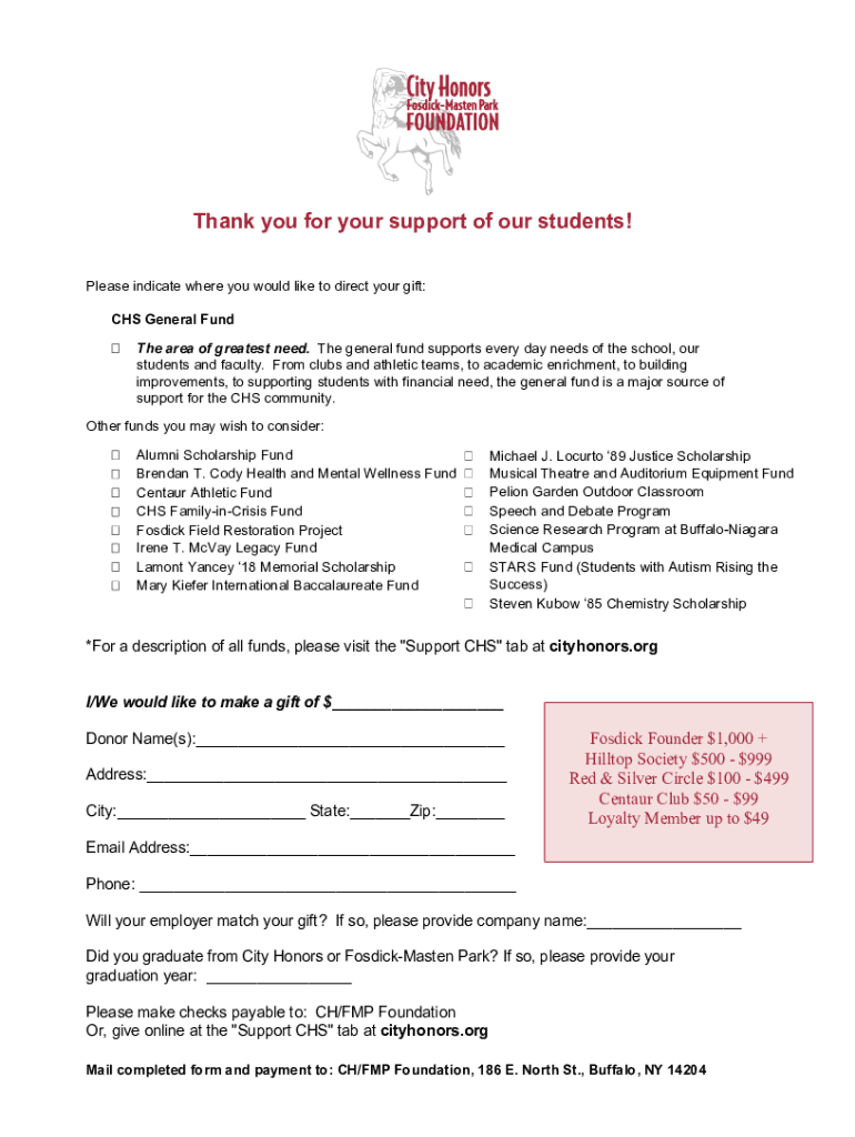 Thank you for your support of our students! Please indicate where you would like to direct your gift: CHS General Fund The area of the greatest need. The general fund supports every day needs of the