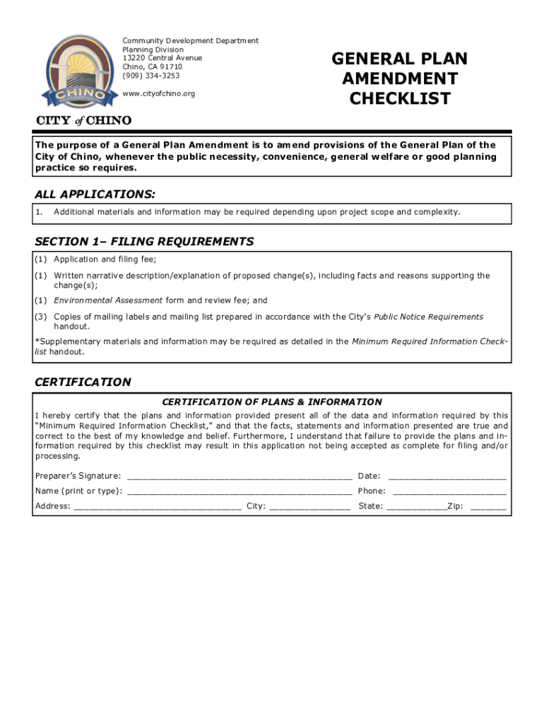 Community Development Department Planning Division 13220 Central Avenue Chino, CA 91710 ×909× 3343253 www.cityofchino.orgGENERAL PLAN AMENDMENT CHECKLISTCITY of CHINO The purpose of a General Plan