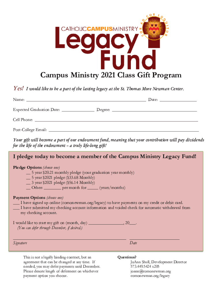 Campus Ministry 2021 Class Gift Program Yes! I would like to be a part of the lasting legacy at the St. Thomas More Newman Center. Name: ___ Date: ___ Expected Graduation Date: ___ Degree: ___ Cell