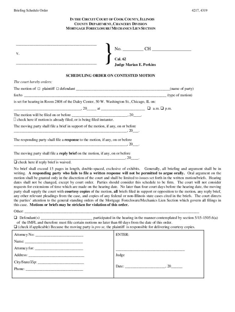 Briefing Schedule Order4217, 4319IN THE CIRCUIT COURT OF COOK COUNTY, ILLINOIS COUNTY DEPARTMENT, CHANCERY DIVISION MORTGAGE FORECLOSURE/ MECHANICS LIEN SECTION___v. ___No. ___ CH ___ Cal. 62 Judge