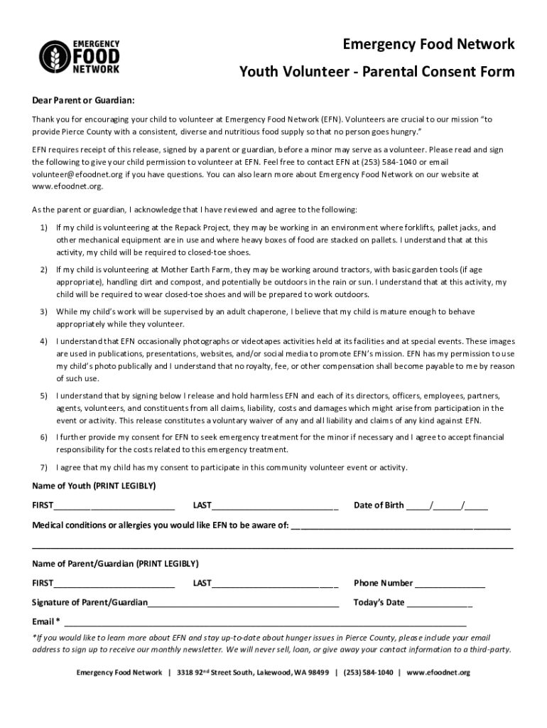 Get the free Emergency Food Network Youth Volunteer - Parental Consent Form