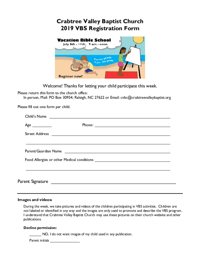 Crab tree Valley Baptist Church 2019 VBS Registration FormWelcome! Thanks for letting your child participate this week. Please return this form to the church office: In person, Mail: PO Box 30954,