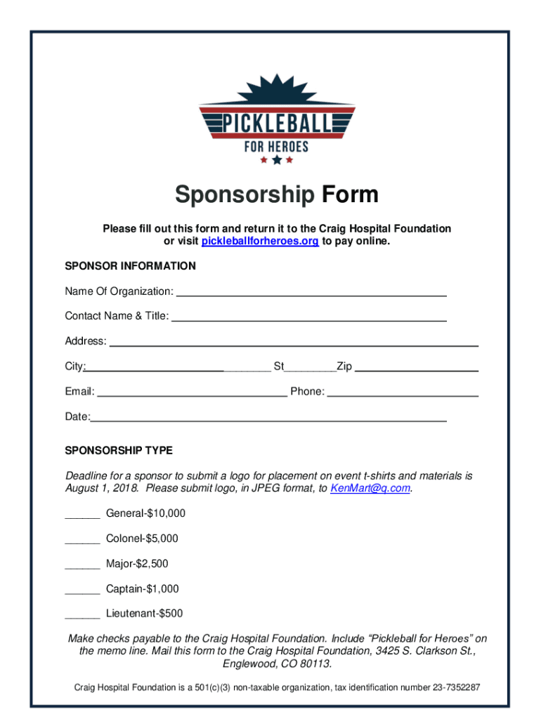 Sponsorship Form Please fill out this form and return it to the Craig Hospital Foundation or visit pickleballforheroes.org to pay online. SPONSOR INFORMATION Name Of Organization: Contact Name & Title: