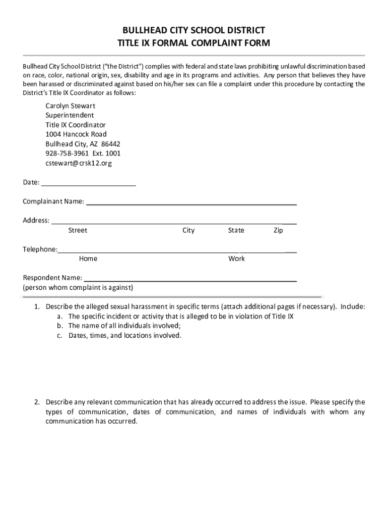 Get the free BULLHEAD CITY SCHOOL DISTRICT TITLE IX FORMAL COMPLAINT FORM