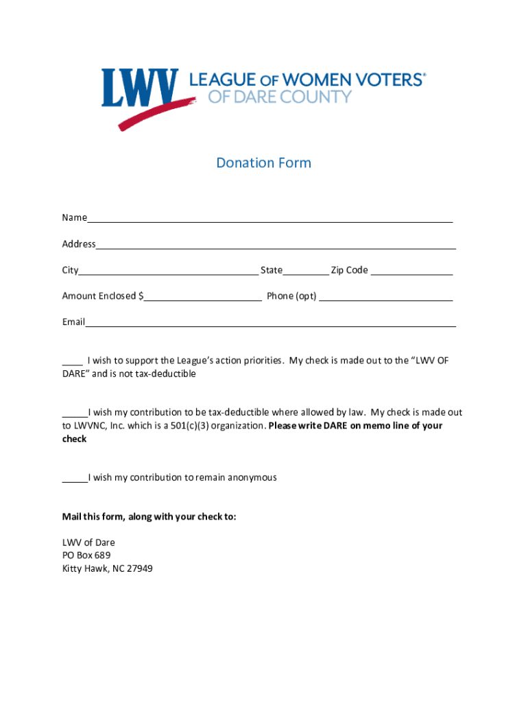 Donation Forename___ Address___ City___ State___ Zip Code ___ Amount Enclosed $___ Phone (opt) ___ Email______ I wish to support the Leagues action priorities. My check is made out to the BWV OF DARE