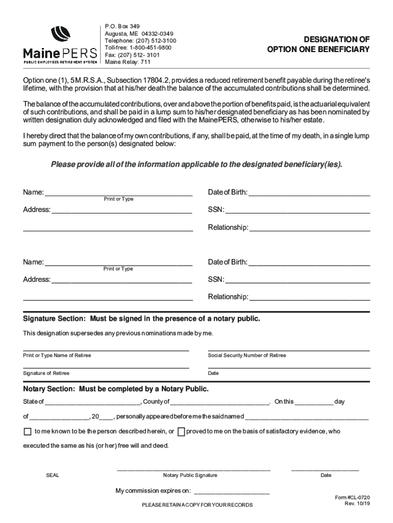 P.O. Box 349 Augusta, ME 043320349 Telephone: (207× 5123100 Toll free: 18004519800 Fax: (207× 512 3101 Maine Relay: 711DESIGNATION OF OPTION ONE BENEFICIARYOption one (1×, 5 M.R.S.A., Subsection