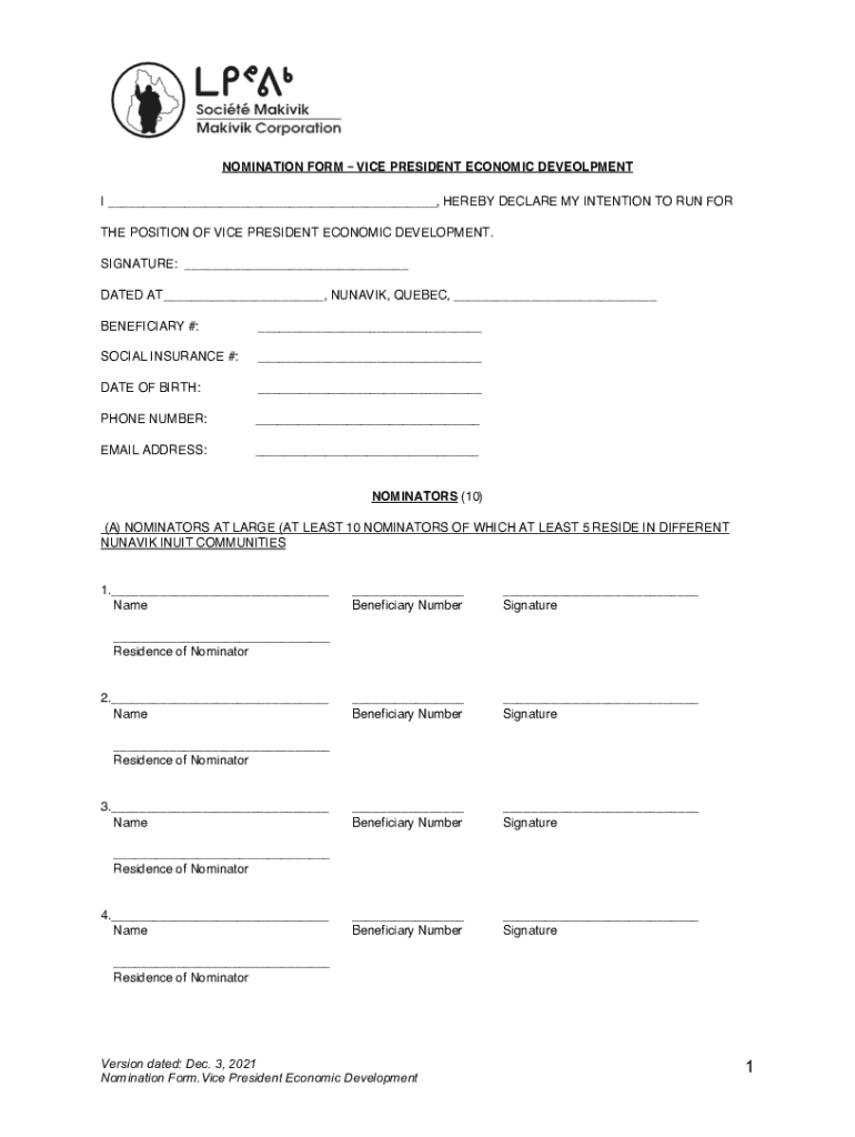 NOMINATION FORM VICE PRESIDENT ECONOMIC DEVELOPMENT I ___, HEREBY DECLARE MY INTENTION TO RUN FOR THE POSITION OF VICE PRESIDENT ECONOMIC DEVELOPMENT. SIGNATURE: ___ DATED AT___, NUNAVUT, QUEBEC,