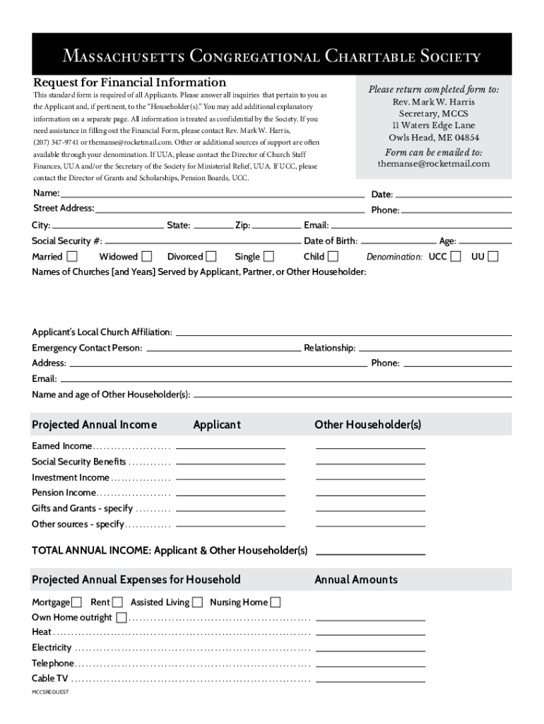 Massachusetts Congregational Charitable Society Request for Financial Information This standard form is required of all Applicants. Please answer all inquiries that pertain to you as the Applicant