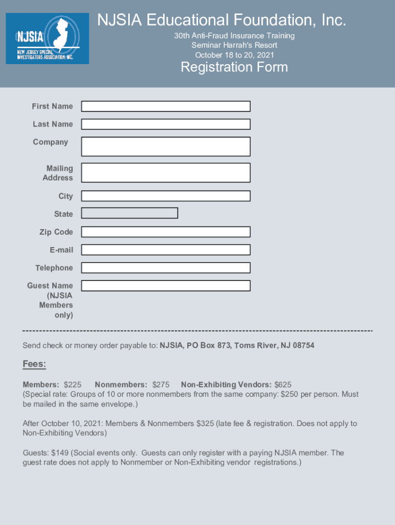 NJ SIA Educational Foundation, Inc. 30th Antifa Insurance Training Seminar Hurrah\'s Resort October 18 to 20, 2021Registration Formalist Name Last Name Company Mailing Address City State Zip Code