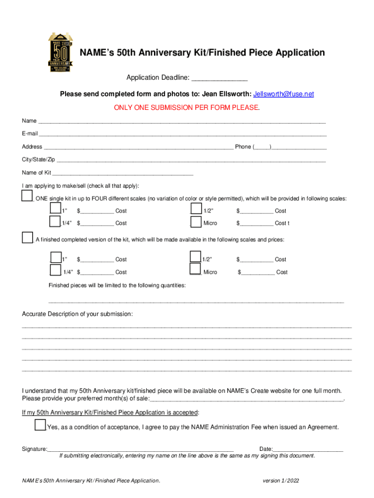 Email, fax, or share your names 50th anniversary kitfinished form via URL. You can also download, print, or export forms to your preferred cloud storage service.