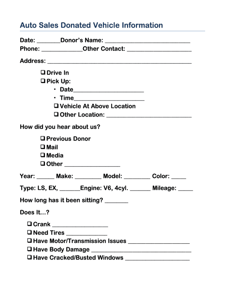 Auto Sales Donated Vehicle Informational: ___Donors Name: ___ Phone: ___Other Contact: ___ Address: ___ Drive In Pickup: Date___ Time___ Vehicle At Above Location Other Location: ___ How did you hear