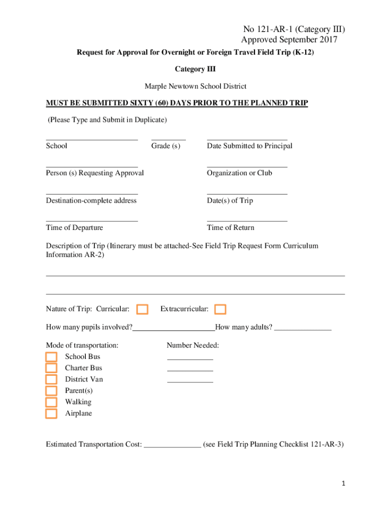 No 121AR1 (Category III) Approved September 2017 Request for Approval for Overnight or Foreign Travel Field Trip (K12) Category III Marple Newton School District MUST BE SUBMITTED SIXTY (60) DAYS