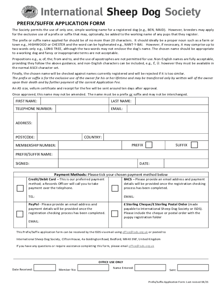 PREFIX×SUFFIX APPLICATION From The Society permits the use of only one, simple working name for a registered dog (e.g., BEN, MAID×. However, breeders may apply for the exclusive use of a prefix