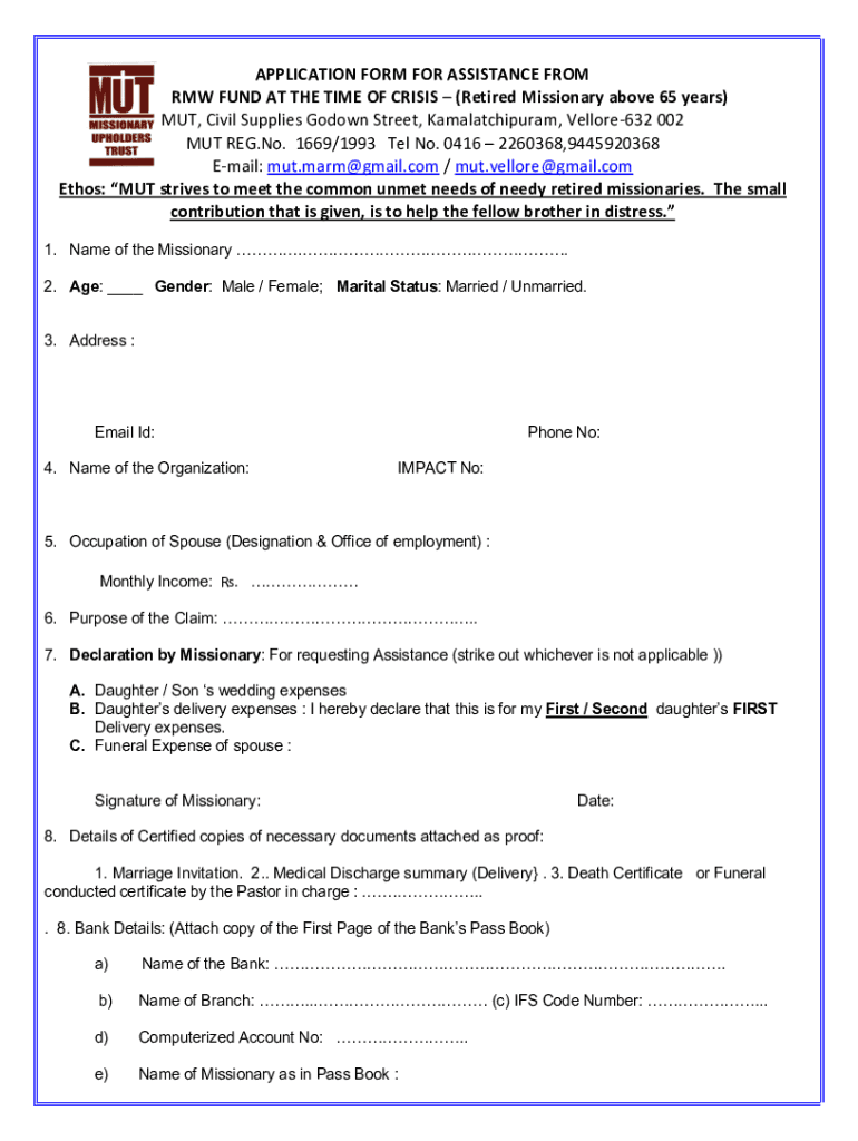 APPLICATION FORM FOR ASSISTANCE FROM RAW FUND AT THE TIME OF CRISIS (Retired Missionary above 65 years) BUT, Civil Supplies Go down Street, Kamalatchipuram, Vellore632 002 BUT REG. No. 1669×1993