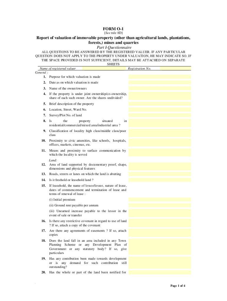 FORM O1 [See rule 8D×Report of valuation of immovable property (other than agricultural lands, plantations, forests, * mines and quarries Part Questionnaire ALL QUESTIONS TO BE ANSWERED BY THE REGISTERED