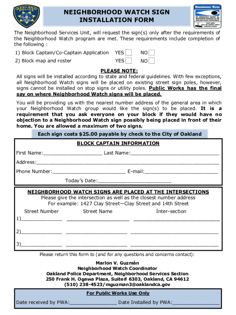 NEIGHBORHOOD WATCH SIGN INSTALLATION FORM The Neighborhood Services Unit, will request the sign’s) only after the requirements of the Neighborhood Watch program are met. These requirements include
