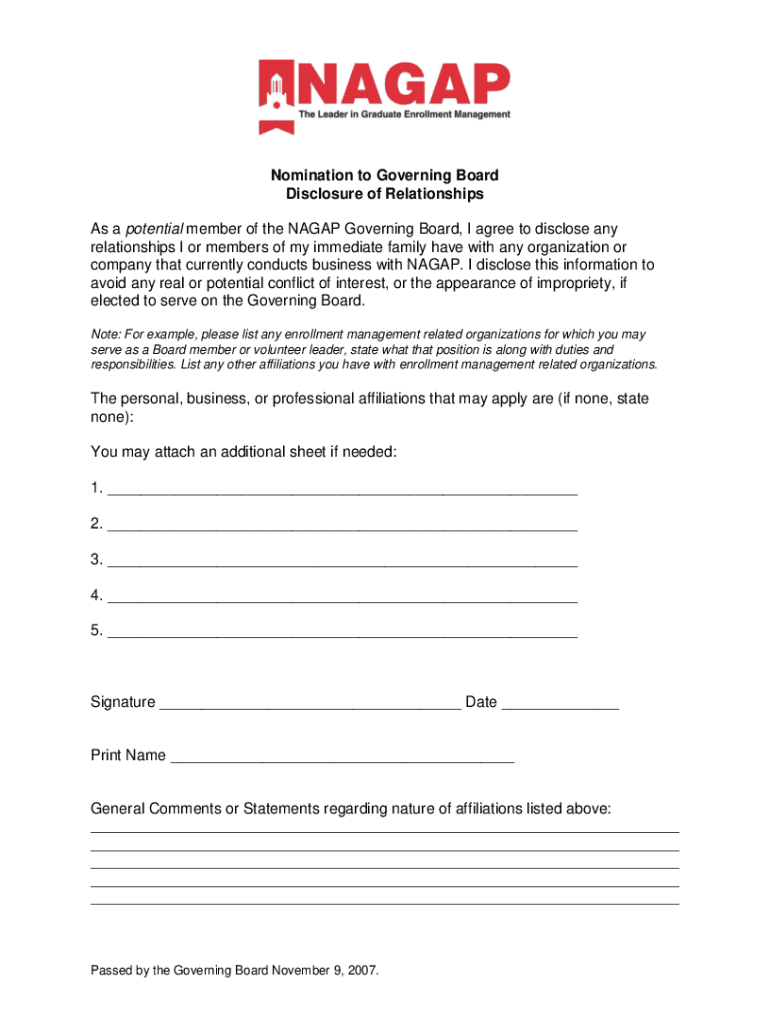 Nomination to Governing Board Disclosure of Relationships As a potential member of the NAG AP Governing Board, I agree to disclose any relationships I or members of my immediate family have with any