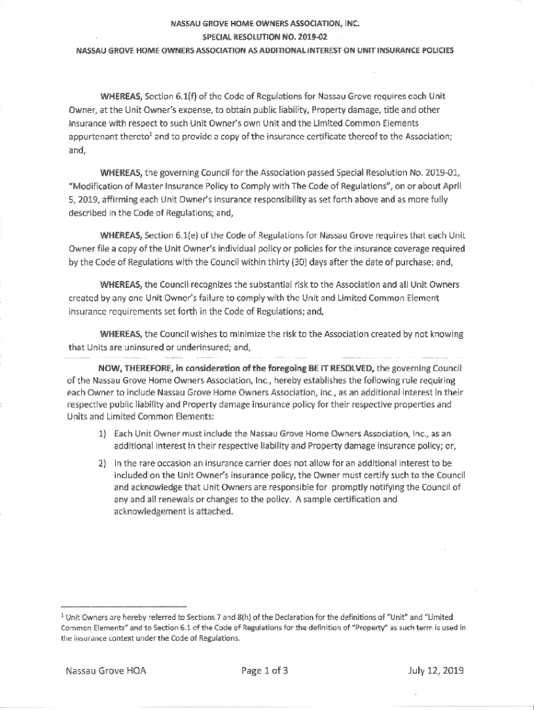 NASSAU GROVE HOMEOWNERS ASSOCIATION, INC. SPECIAL RESOLUTION NO. 201902 NASSAU GROVE HOMEOWNERS ASSOCIATION AS ADDITIONAL INTEREST ON UNIT INSURANCE POLICIESNOTIFICATION TO COUNCIL INABILITY TO INCLUDE