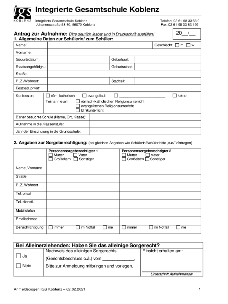 Integrate Gesamtschule Koblenz Integrate Gesamtschule Koblenz Johannesstrae 5860, 56070 KoblenzTelefon: 02 6198 33 63 0 Fax: 02 6198 33 63 19920__/__Ant rag our Surname: Bitter gemütlich lesser UND