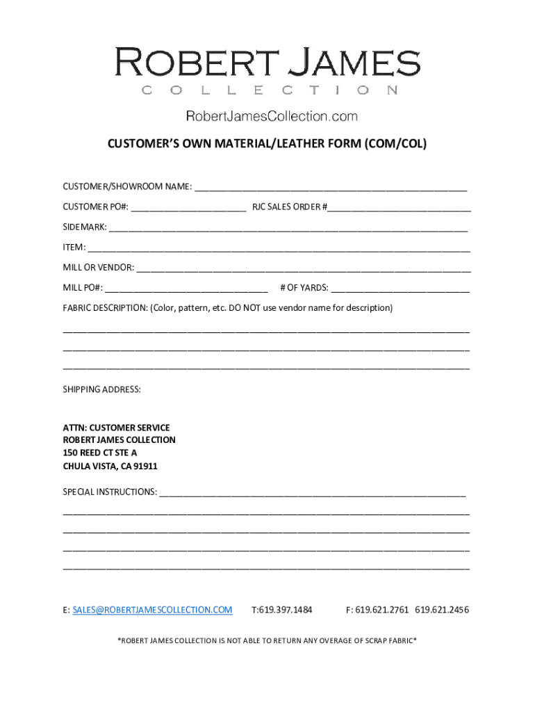 CUSTOMERS OWN MATERIAL×LEATHER FORM (COM×COL) CUSTOMER×SHOWROOM NAME: ___ CUSTOMER PO#: ___ ROC SALES ORDER #___ TIDEMARK: ___ ITEM: ___ MILL OR VENDOR: ___ MILL PO#: ___# OF YARDS: ___FABRIC DESCRIPTION: