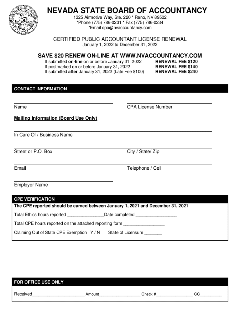 NEVADA STATE BOARD OF ACCOUNTANCY 1325 Air motive Way, Ste. 220 * Reno, NV 89502 *Phone (775× 7860231 * Fax (775× 7860234 *Email CPA×accountancy.certified PUBLIC ACCOUNTANT LICENSE RENEWAL January