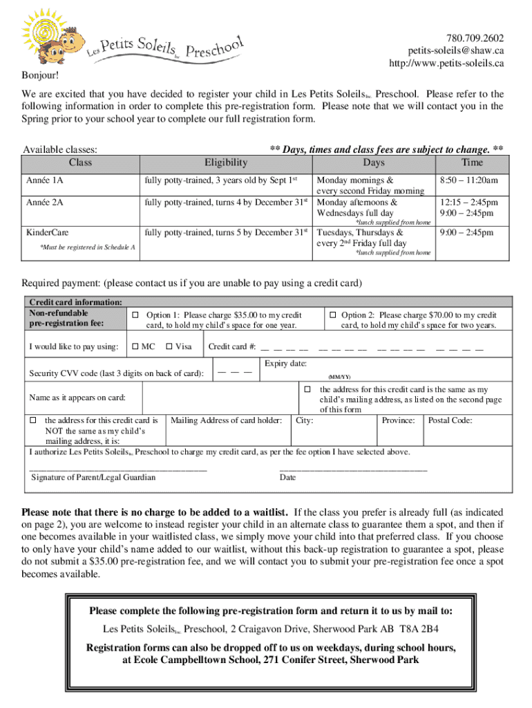 780.709.2602 petitssoleils×Shaw.ca HTTP://www.petitssoleils.ca Bonjour! We are excited that you have decided to register your child in Les Petite Pleasing. Preschool. Please refer to the following