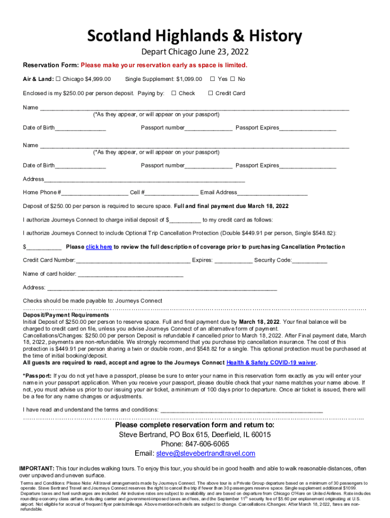 Scotland Highlands & History Depart Chicago June 23, 2022Reservation Form: Please make your reservation early as space is limited. Air & Land: Chicago $4,999.00Single Supplement: $1,099.00Enclosed