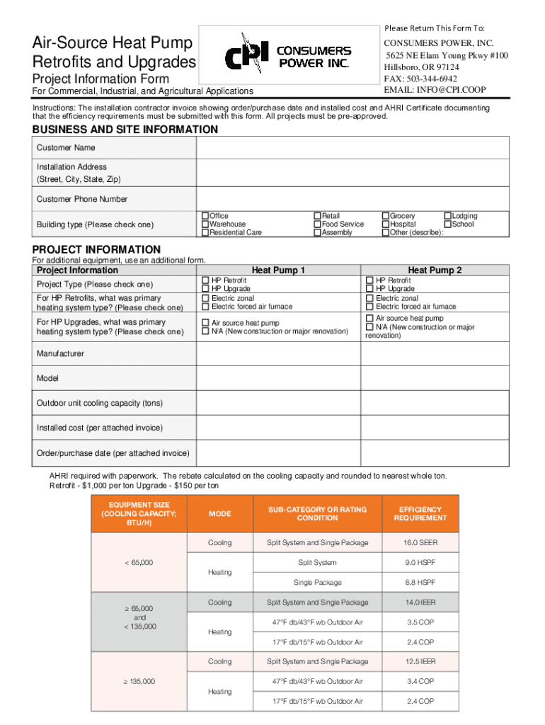 Please Return This Form To:AppSource Heat Pump Retrofits and UpgradesCONSUMERS POWER, INC. 5625 NE Elam Young Pkwy #100 Hillsboro, Hillsboro, OR 97124 FAX: 5033446942 EMAIL: INFO×CPI.COOPProject