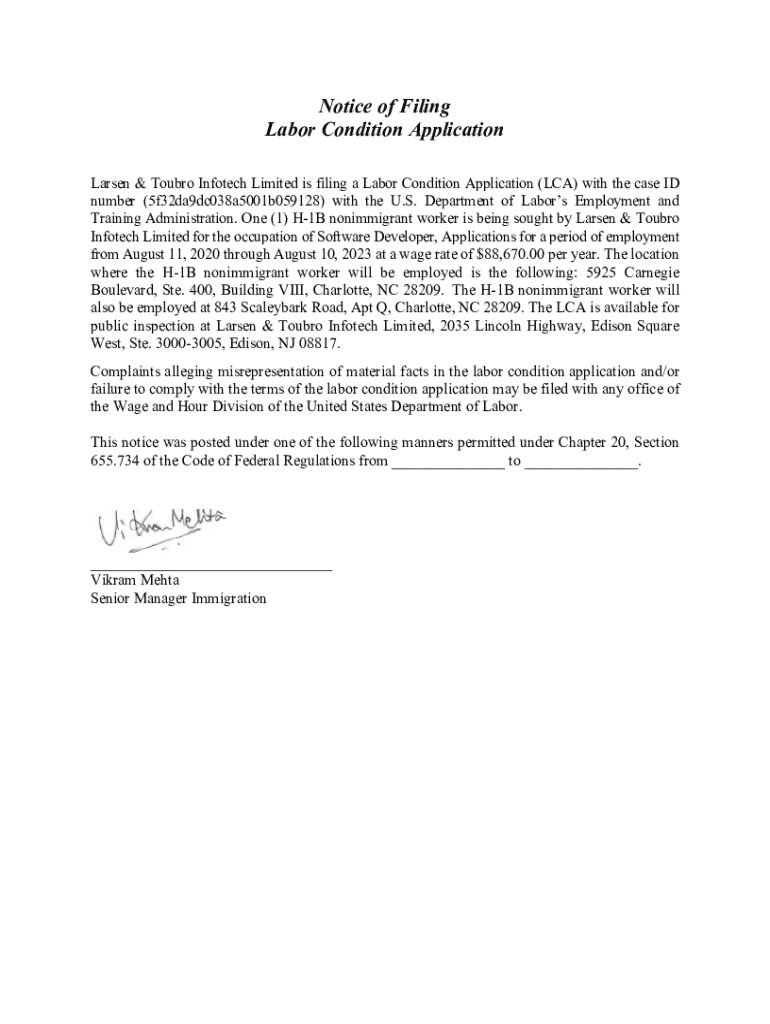 Notice of Filing Labor Condition Application Larsen & Tour Info tech Limited is filing a Labor Condition Application (LCA) with the case ID number (5f32da9dc038a5001b059128) with the U.S. Department