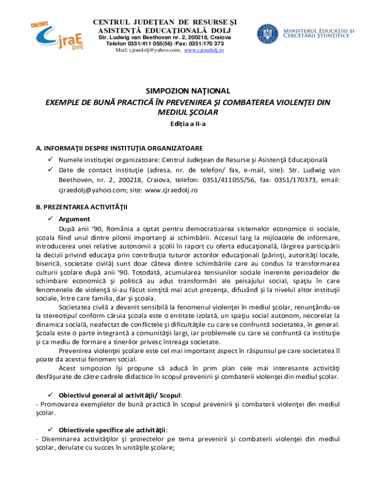 CENTRAL JUDEA DE RESURGE I SISTER EDUCATIONAL DOLL STR. Ludwig van Beethoven NR. 2, 200218, Crayola Telephone 0351×411 055×56) /Fax: 0351×170 373 Mail: cjraedolj×yahoo.com; www.cjraedolj.roSIMPOZION