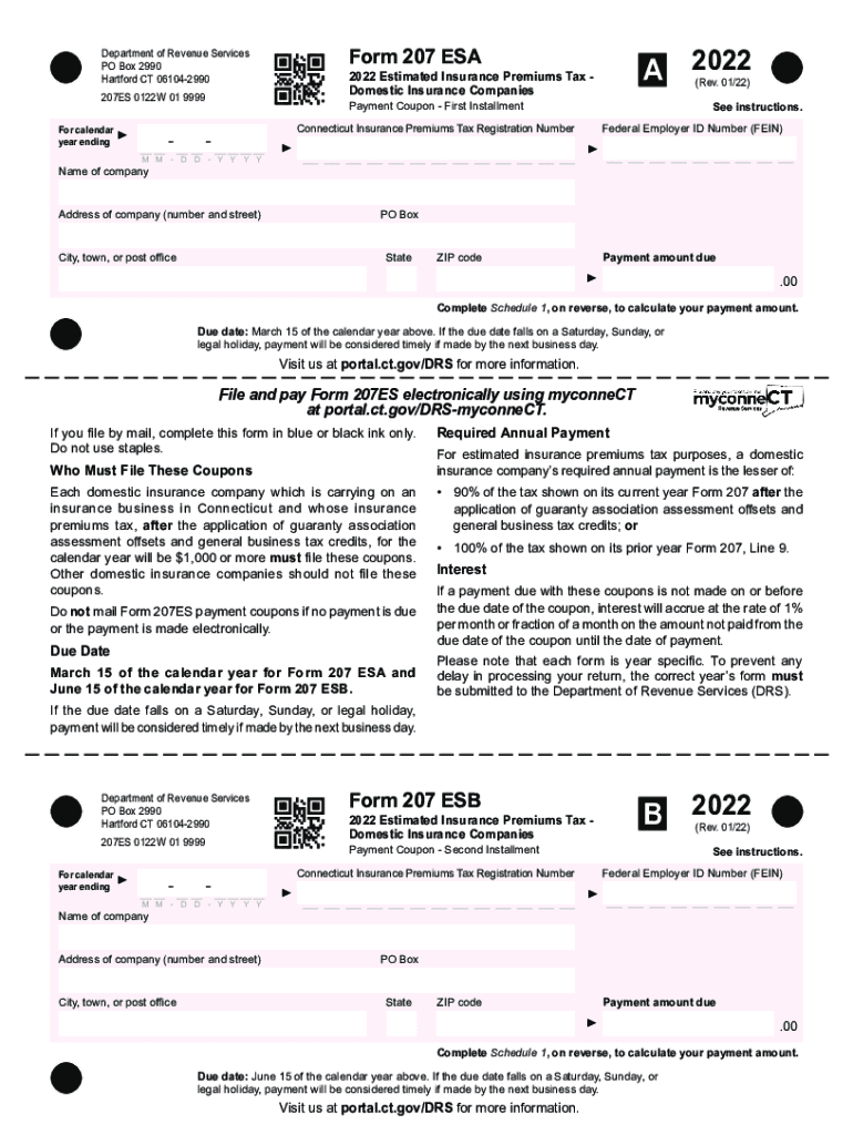 A 2022Form 207 Department of Revenue Services PO Box 2990 Hartford CT 0610429902022 Estimated Insurance Premiums Tax Domestic Insurance Companies207ES 0122W 01 9999×Rev. 01×22)See instructions.