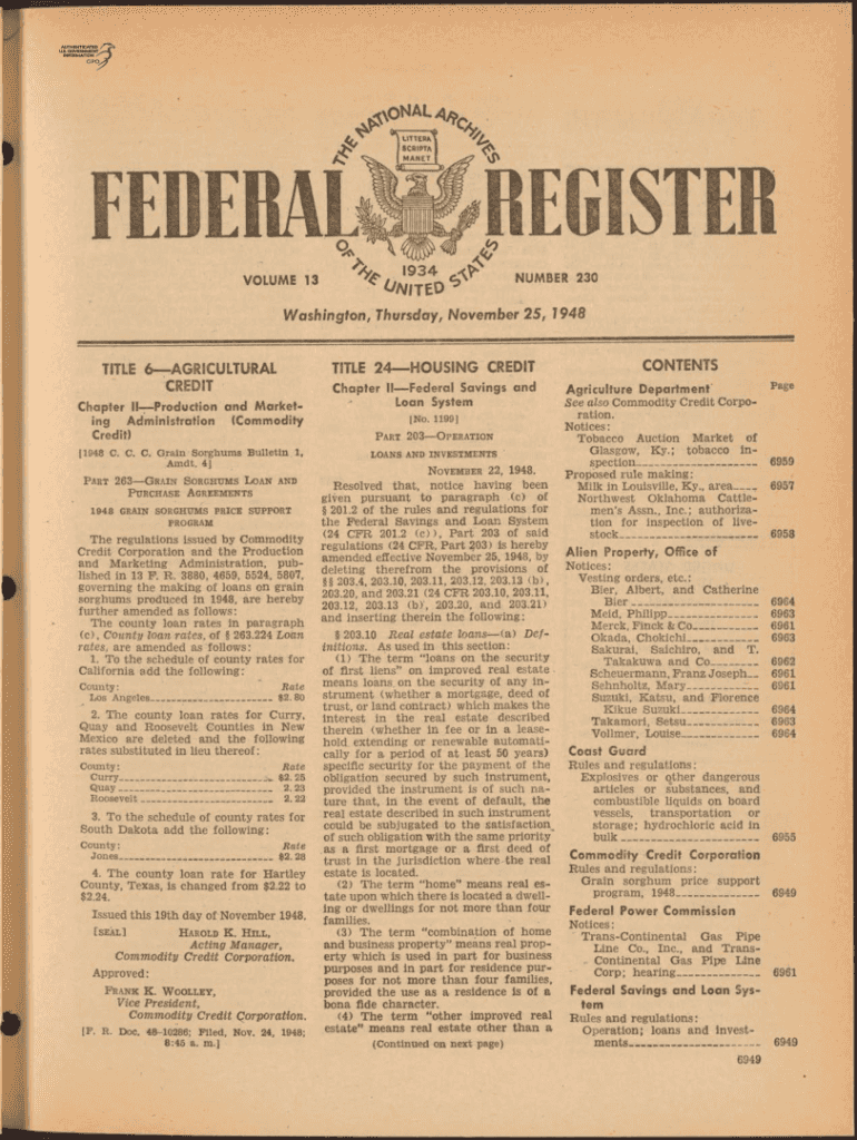 VOLUME 131934×Junto NUMBER 230Washington, Thursday, November 25, 1948TITLE 24 HOUSING CREDITABLE 6 AGRICULTURAL CREDIT Chapter II Production and Market ING Administration (Commodity Credit) [1948