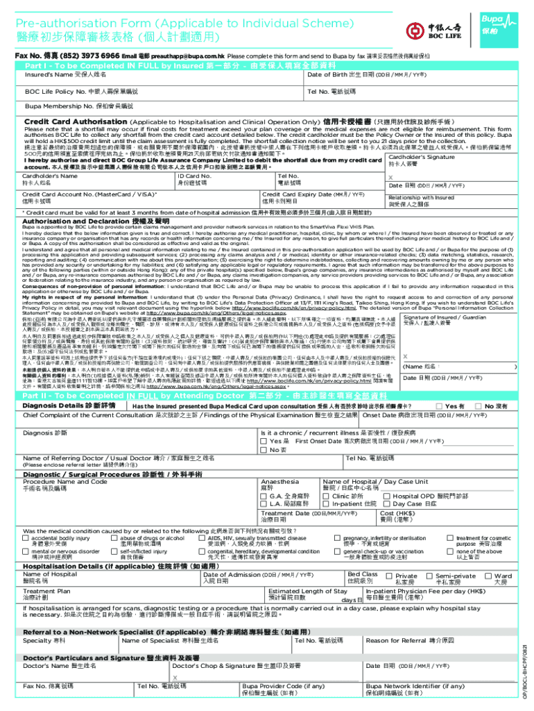 Preauthorization Form (Applicable to Individual Scheme) () Fax No. (852× 3973 6966 Email preauthapp×bupa.com.HK Please complete this form and send to BPA by fax Part I To be Completed IN FULL by