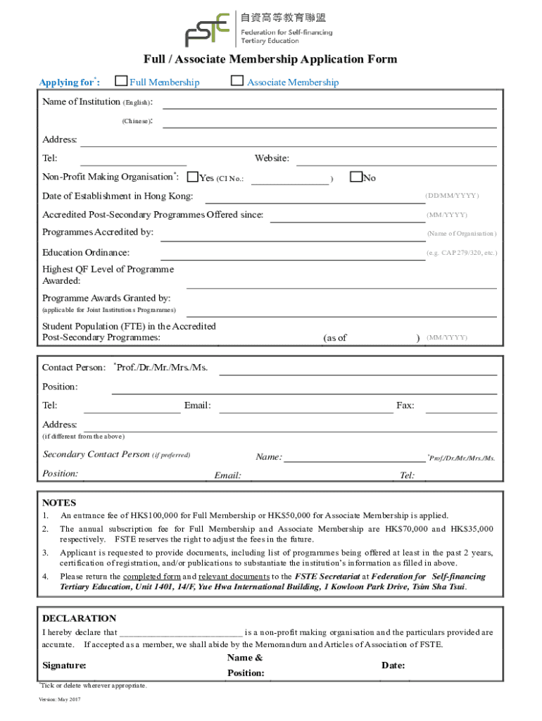 Full / Associate Membership Application Form Applying for*: Full Membership Associate MembershipName of Institution (English): (Chinese):Address: Tel:Website:Nonprofit Making Organization*:Yes (CI