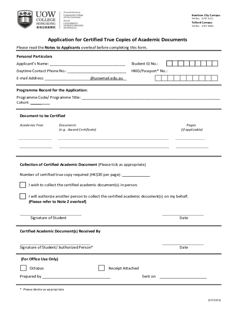 Kowloon City Campus Tel No.: 2707 3111Telford Campus Tel No.: 2707 9440Application for Certified True Copies of Academic Documents Please read the Notes to Applicants overleaf before completing this