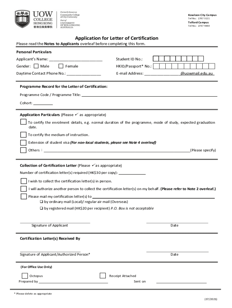 Kowloon City Campus Tel No.: 2707 3111Telford Campus Tel No.: 2707 9440Application for Letter of Certification Please read the Notes to Applicants overleaf before completing this form. Personal Particulars