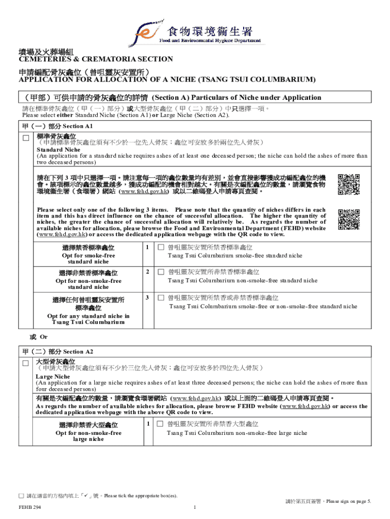 CEMETERIES & CREMATORIA SECTION APPLICATION FOR ALLOCATION OF A NICHE (SANG SUI COLUMBARIUM) (Section A) Particulars of Niche under Application Please select either Standard Niche (Section A1) or