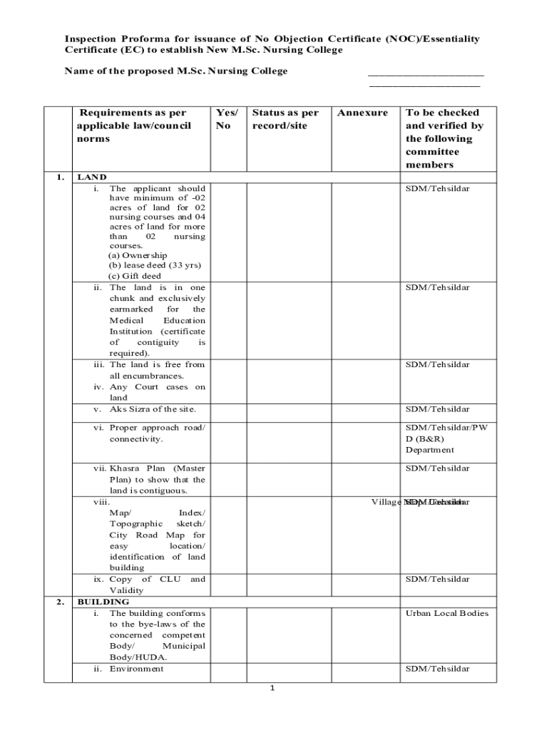 Inspection Proforma for issuance of No Objection Certificate (NOC)/Essentially Certificate (EC) to establish New M.Sc. Nursing College Name of the proposed M.Sc. Nursing CollegeRequirements as per