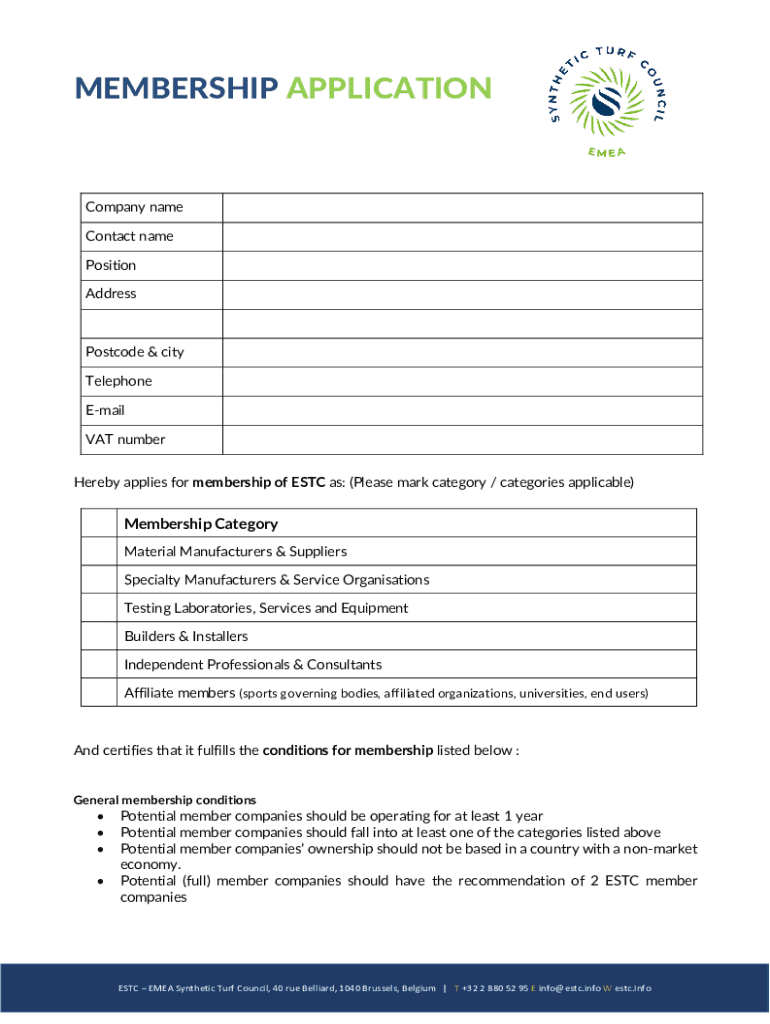 MEMBERSHIP APPLICATIONCompany name Contact name Position AddressPostcode & city Telephone Email VAT number Hereby applies for membership of ETC as: (Please mark category / categories applicable×Membership