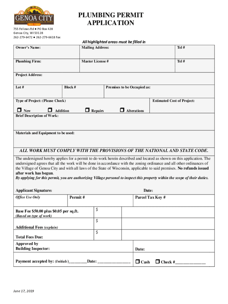 PLUMBING PERMIT APPLICATION 755 Fellows Rd PO Box 428 Genoa City, WI 53128 2622796472 2622796618 Fall highlighted areas must be filled in Owners Name:Mailing Address:Tel #Plumbing Firm:Master License