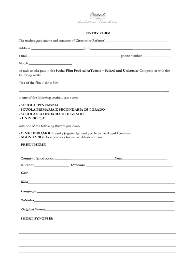 ENTRY From The undersigned (name and surname of Director or Referent)__Address ___ City ___ email ___ phone number___ _Mobile ___ intends to take part in the Social Film Festival Artless School and