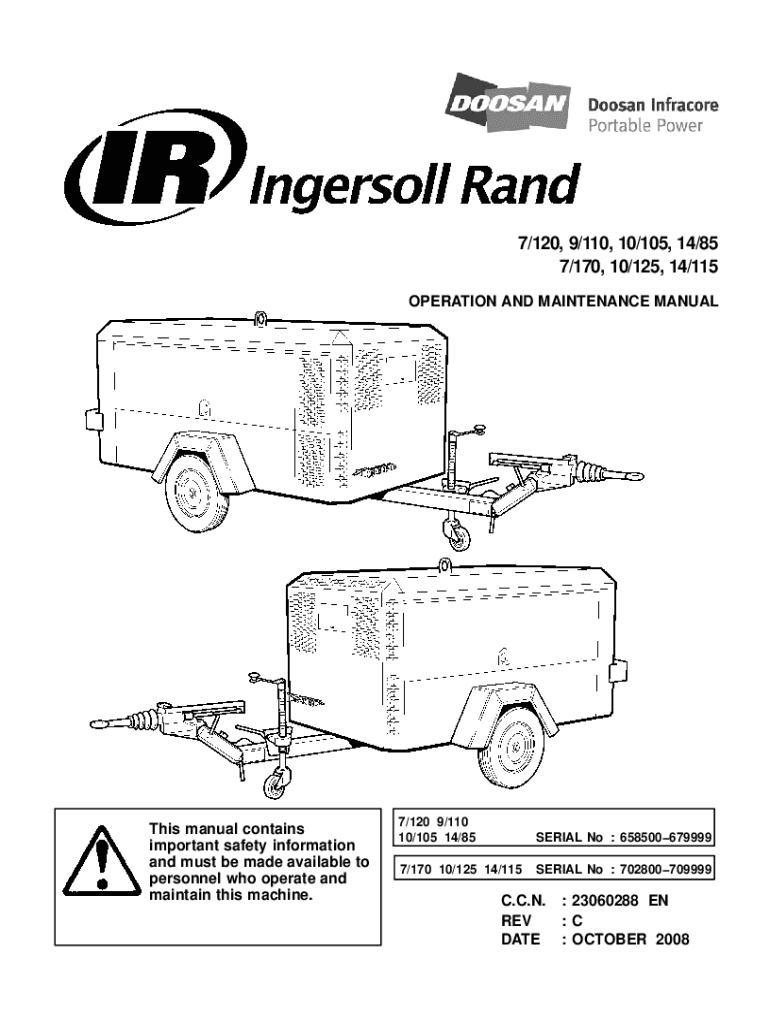 7×120, 9×110, 10×105, 14×85 7×170, 10×125, 14×115 OPERATION AND MAINTENANCE Manuals manual contains important safety information and must be made available to personnel who operate and maintain