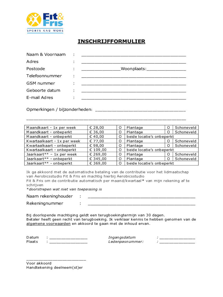 Get the free INSCHRIJFFORMULIER - Aerobics Studio Fit & Fris Houten