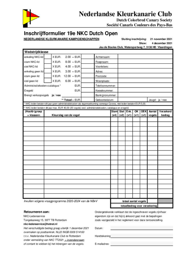 Nederland Kleurkanarie Club Dutch Color bred Canary Society So cit Canaries Couplers DES PaysBasInschrijfformulier 19e NFC Dutch Open NEDERLAND KLEURKANARIE KAMPIOENSCHAPPENSluiting inscribing:21
