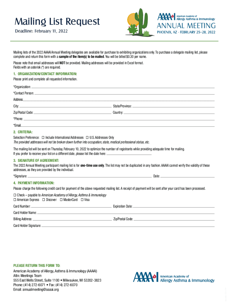 Mailing List Request Deadline: February 11, 2022Mailing lists of the 2022 AAAA Annual Meeting delegates are available for purchase to exhibiting organizations only. To purchase a delegate mailing