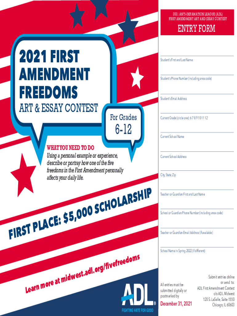 2021 ANTIDEFAMATION LEAGUE (ADL) FIRST AMENDMENT ART AND ESSAY CONSISTENTLY FORM2021 FIRST AMENDMENT FREEDOM SART & ESSAY CONTESTStudents First and Last NameStudents Phone Number (including area code×Students